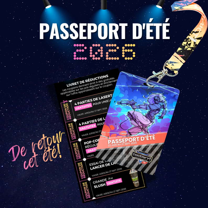 ➡️ Profite de jusqu’à 4 parties de Lasertag par jour du 22 juin au 27 sept 2026 (76 jours de validité), avec ton nom au tableau de pointage, tes statistiques de joueur et des gratuités exclusives.